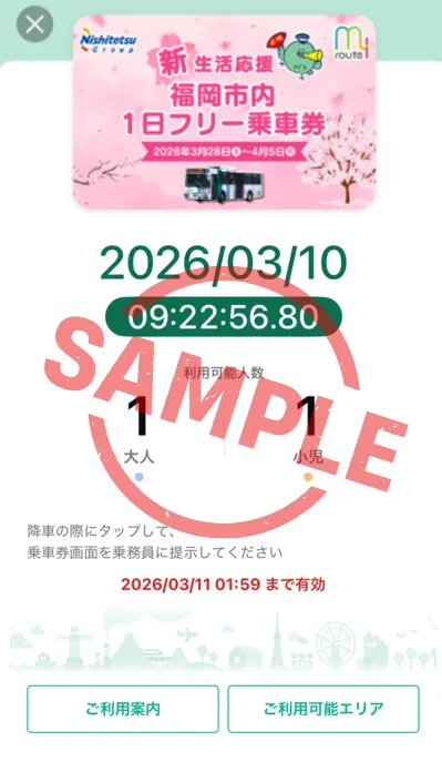 キャンペーンの目玉は、人気の「my route」を利用した『西鉄バス 福岡市内1日フリー乗車券』です。このデジタル乗車券は通常1,200円のところ、特別価格の300円で販売され、福岡の公共交通機関へ簡単にアクセスできます。購入はおひとり様最大2回、合計2枚まで可能で、特定の条件を満たしている必要があります。