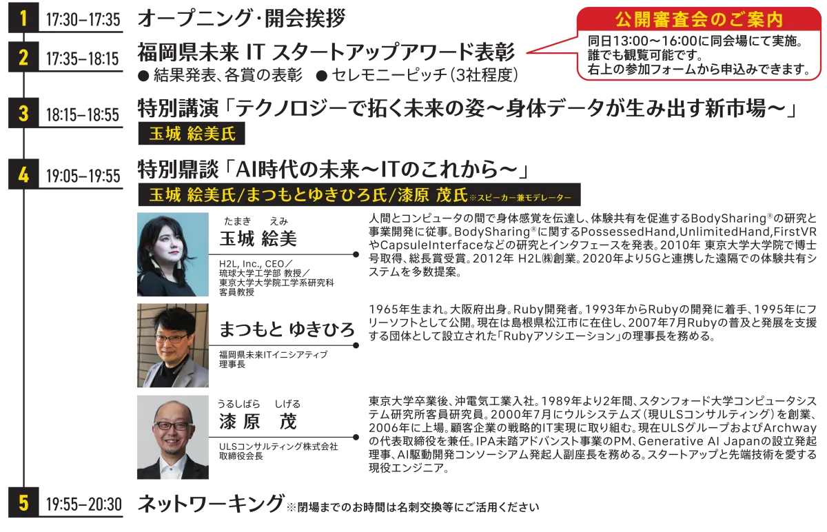 福岡県は、令和6年度に「福岡県未来ITイニシアティブ」を設立し、本県のIT産業の持続的な発展を目指します。その一環として行われる「福岡県未来ITスタートアップフォーラム」では、県内のエンジニアやIT起業家を対象としたイベントが企画されています。このフォーラムでは、先端技術の社会実装に取り組む研究者として名高い玉城氏が登壇し、エンジニアやシリコンバレーでの経験があるRubyの開発者であるまつもとゆきひろ氏、そしてULSコンサルティングの漆原氏と共に「AI」をテーマに、IT業界の未来について活発な議論が展開されます。