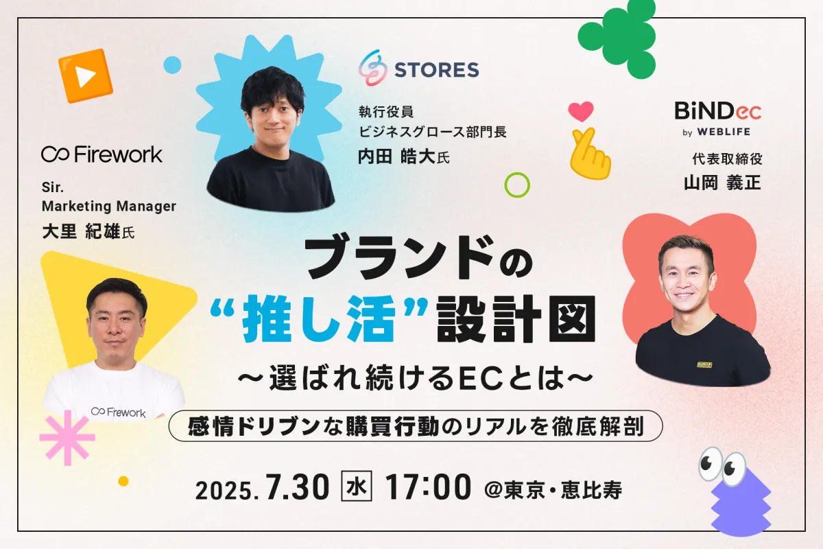 お店のデジタル化を手がけるSTORES株式会社が、株式会社ウェブライフおよびFirework Japan株式会社と共催し、「ブランドの“推し活”設計図 ─ 選ばれ続けるECとは」というテーマの対面セミナーを開催します。このセミナーは、2025年7月30日(水)に東京都渋谷区のSTORESオフィスで行われます。