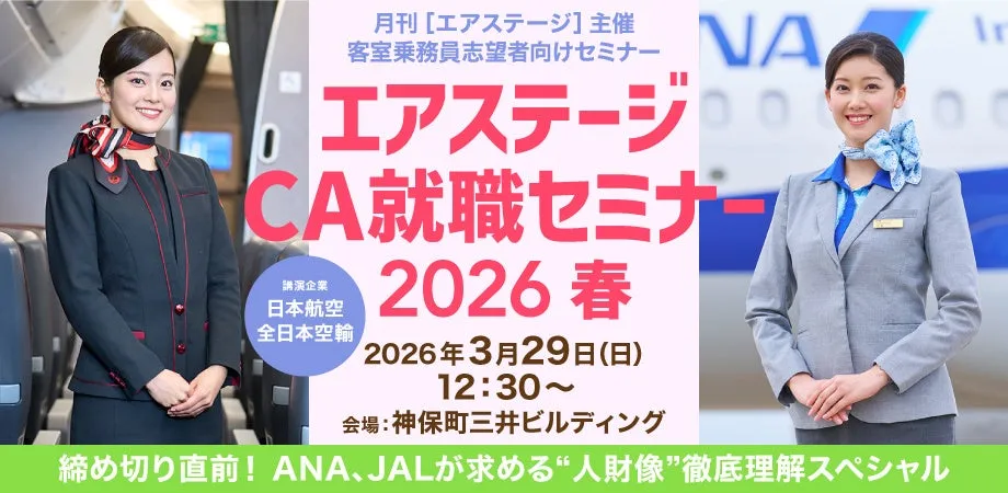 日本の航空業界でのキャリアを目指す方々に向けた「エアステージCA就職セミナー 2026春」の開催が発表されました。このイベントは、全日本空輸(ANA)と日本航空(JAL)の現役職員を招き、参加者が求められる人材像や具体的な採用試験について学べる貴重な機会です。開催日は2026年3月29日(日)で、会場は東京都千代田区の神保町三井ビルディング23Fです。