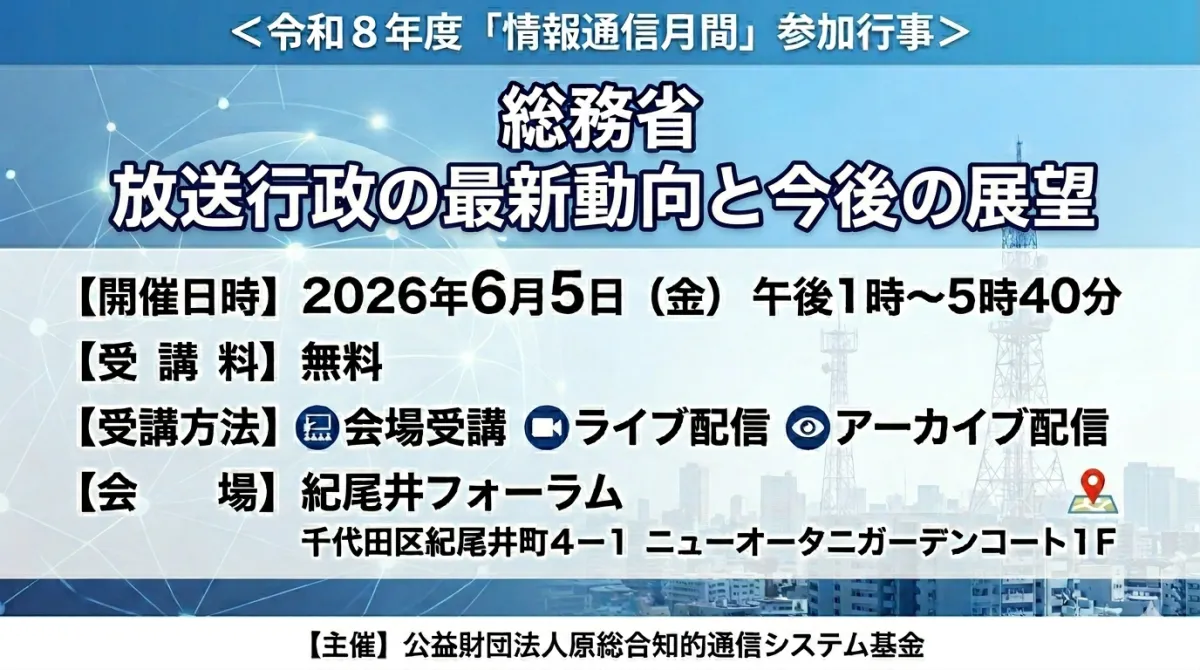 2026年6月5日(金)、東京都千代田区の紀尾井フォーラムで「総務省放送行政の最新動向と今後の展望」というテーマのセミナーが開催されることが決定しました。本セミナーは、最新のICT情報を発信する新社会システム総合研究所が、公益財団法人原総合知的通信システム基金との業務受託に基づき実施します。セミナーは、13時から17時40分まで行われ、放送行政に関する専門的な知識や政策の最新潮流が紹介される予定です。