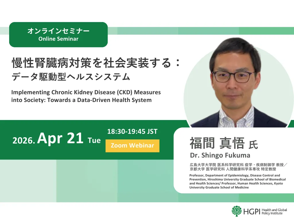2026年4月21日(火)に、特定非営利活動法人 日本医療政策機構(HGPI)が主催するオンラインセミナー「慢性腎臓病対策を社会実装する:データ駆動型ヘルスシステム」が開催されます。このセミナーは、参加費が無料で誰でも参加可能となっています。