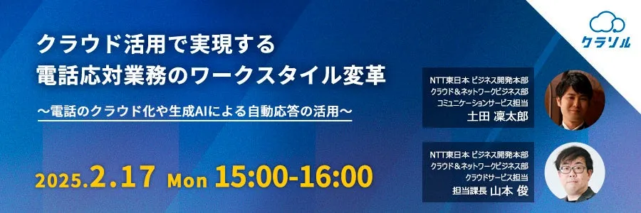 今回のウェビナーでは、クラウド電話システムの導入方法や生成AIの効果的な活用について詳しく説明します。具体的な導入事例も交えつつ、クラウド活用による電話業務の効率化のポイントや、受電業務の新たな形を提案します。