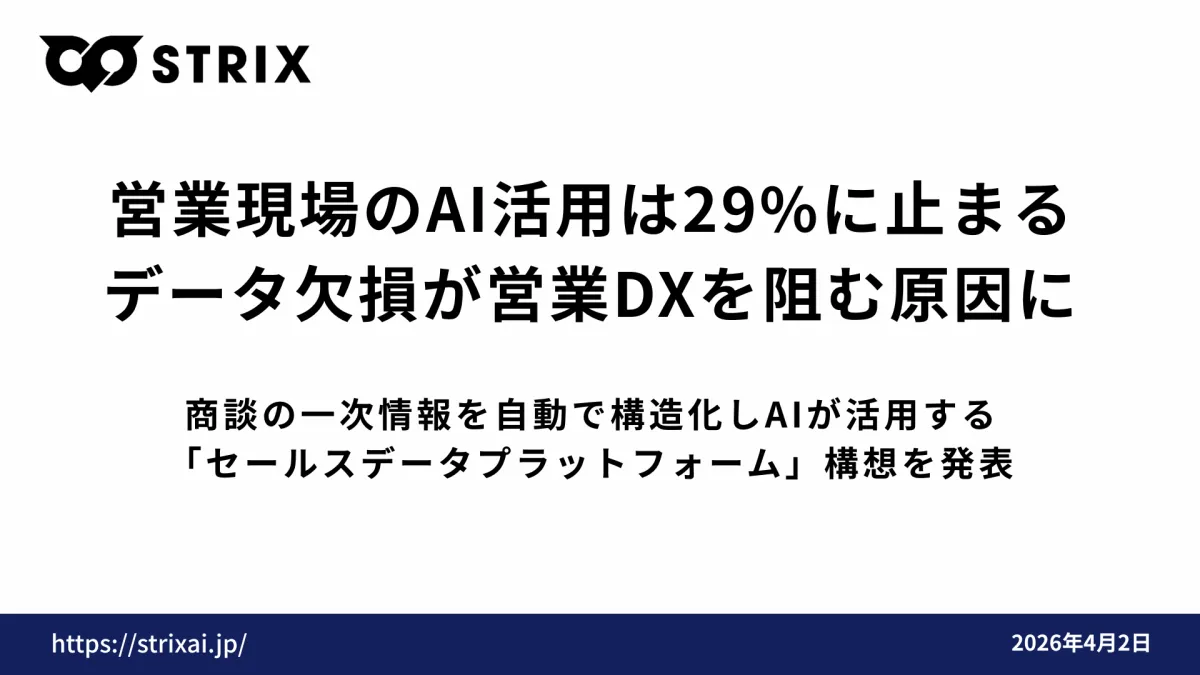 日本企業の多くが日々進化を続けるAI技術を導入していますが、営業の現場では依然として多くの課題が残されています。株式会社MEDIUMが提供するSTRIXは、営業データの蓄積と構造化を可能にし、商談のブラックボックス化を解消します。これによって営業現場でのAI活用が飛躍的に進展することを期待しています。