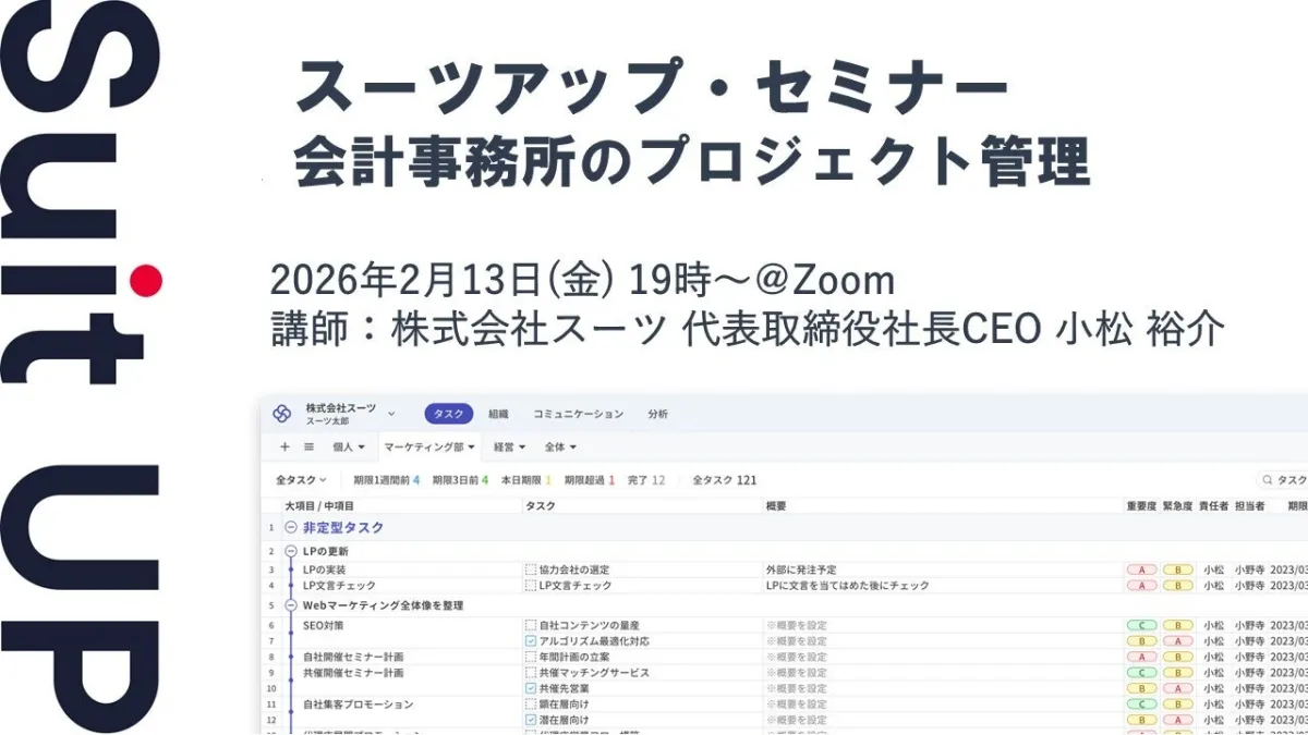株式会社スーツが主催する「会計事務所のプロジェクト管理」セミナーが、2026年2月13日(金)19時より開催されます。このセミナーでは、経営支援クラウドのAIツール「スーツアップ」を活用し、チームでのタスク管理の方法を解説します。セミナーの講師は当社の代表小松裕介が務め、参加者の実務に役立つ具体的な事例やノウハウを共有します。