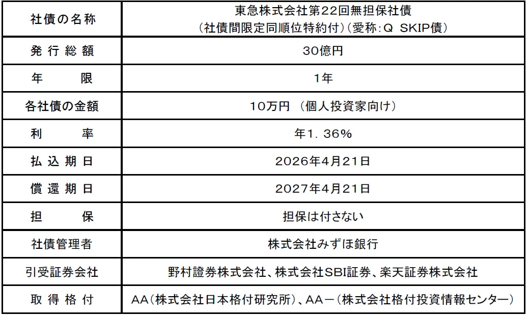 東京に本社を置く東急株式会社は、2026年3月26日付けで、新しい個人向け社債『Q SKIP債』の発行条件を発表しました。この社債は、株式会社NTTデータとSecurtize Japanが提供するデジタル証券プラットフォーム『STdirect Services』を活用したもので、デジタル特典が付与される点が大きな魅力です。