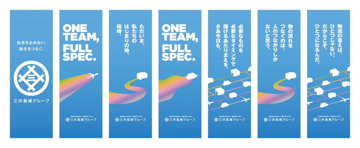 「ONE TEAM, FULL SPEC.」というスローガンは、グループ会社同士の連携を強化し、陸・海・空の多様な物流機能を最適に繋げることで、より高い価値を提供する意義を表しています。広告展開を通じて、より多くの人々に三井倉庫グループの事業を知ってもらい、理解を深めてもらうことを目指しています。