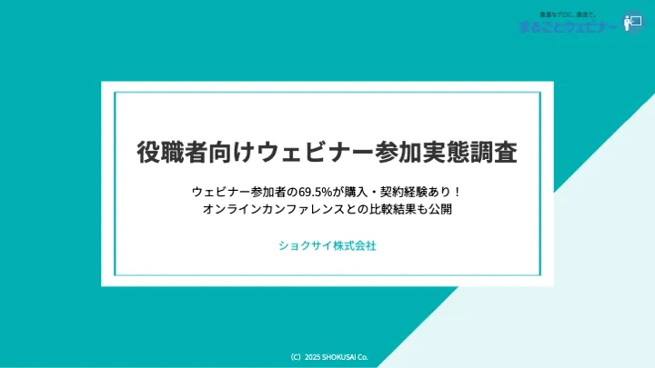 ショクサイ株式会社が行った「ウェビナー参加実態調査」では、役職者を対象に最近のウェビナーの参加状況を明らかにしました。調査の結果、参加者の69.5%がウェビナー参加後に商品やサービスの購入・契約経験があると回答し、ウェビナーが高いコンバージョン率を持つマーケティング手法であることが浮き彫りになりました。