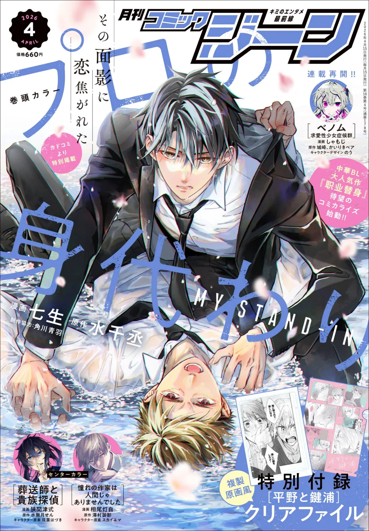 本号の表紙は、漫画家・七生さんが手がけた『プロの身代わり』のビジュアルで、読者の目を引きます。また、特別付録として『平野と鍵浦』の複製原画風クリアファイルも付いてきます。