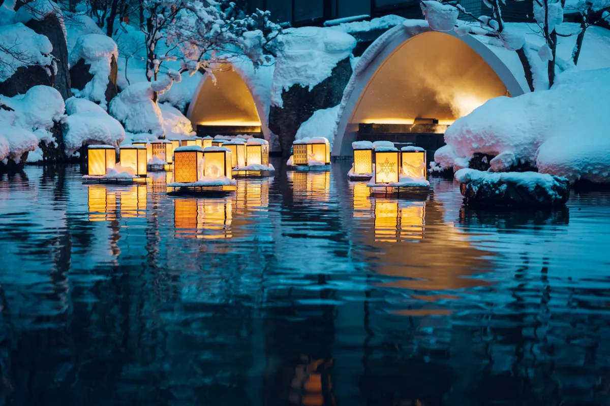 旅館内には、アーチ型の屋根で覆われた「かまくら露天風呂」があります。この露天風呂は、まるでかまくらの中にいるような感覚を味わわせてくれます。薄暗い外の世界と対照的に、湯船の中でリラックスしながら、目の前の雪景色に心を奪われます。水庭の対岸には「こぎんかまくら」が現れ、灯篭の柔らかい光が雪に映え、一層幻想的な雰囲気を醸し出します。