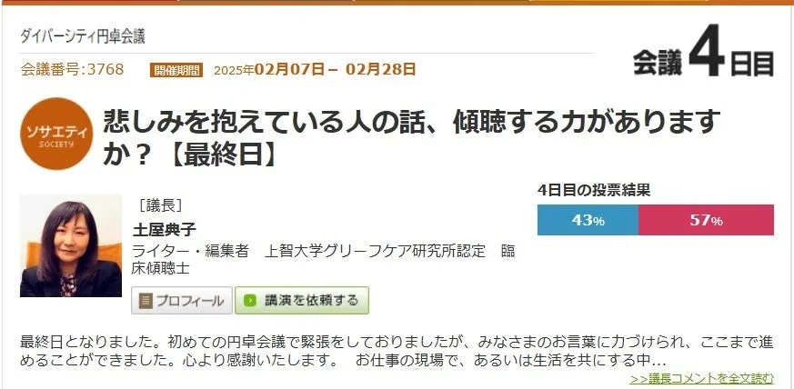 3768テーマ目では、「悲しみを抱えている人の話、傾聴する力がありますか?」という問いが立てられました。議長の土屋氏は、「悲しみから早く回復することを求められることがあるが、その過程でさらに傷ついてしまうケースも多い」と指摘します。傾聴や共感についての自問自答を促し、どのように接するべきかを参加者に問いかけました。