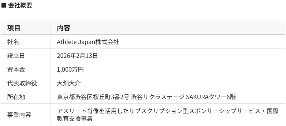 2023年に設立されたAthlete Japan株式会社は、元ラグビー日本代表の大畑大介氏を代表として、元 MLB の上原浩治氏、プロテニスプレイヤーの杉山愛氏という三人のトップアスリートによって立ち上げられました。本企業が目指しているのは、サブスクリプション型サービスを通じて企業のブランド力を引き上げることと、貧困教育支援を同時に実現することです。