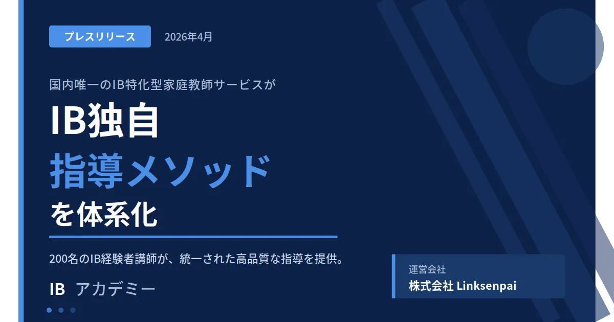 株式会社Linksenpaiが運営する「IBアカデミー」は、インターネットを通じて提供されるIB(国際バカロレア)専門の家庭教師サービスです。IBに特化した独自の指導メソッドを採用しており、IB経験者の講師が200名以上在籍しています。