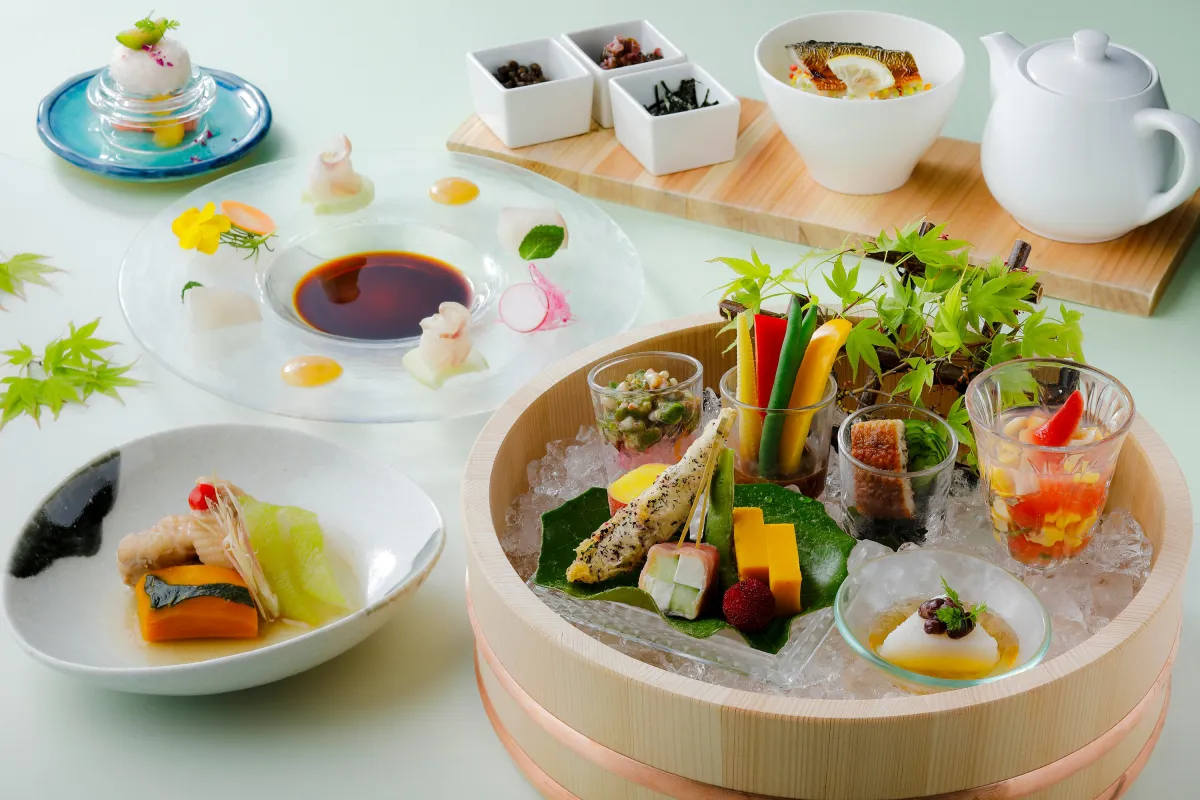 前菜には、夏越の祓いにちなんだ「水無月豆腐」をはじめ、蛸の柔煮や近江の肉味噌を使った夏野菜のディップ、さらには琵琶湖産の小鮎の揚げ物など、見た目にも涼しげな色彩豊かな料理が並びます。11種類ものバリエーションが楽しめ、ゲストの食欲をそそります。