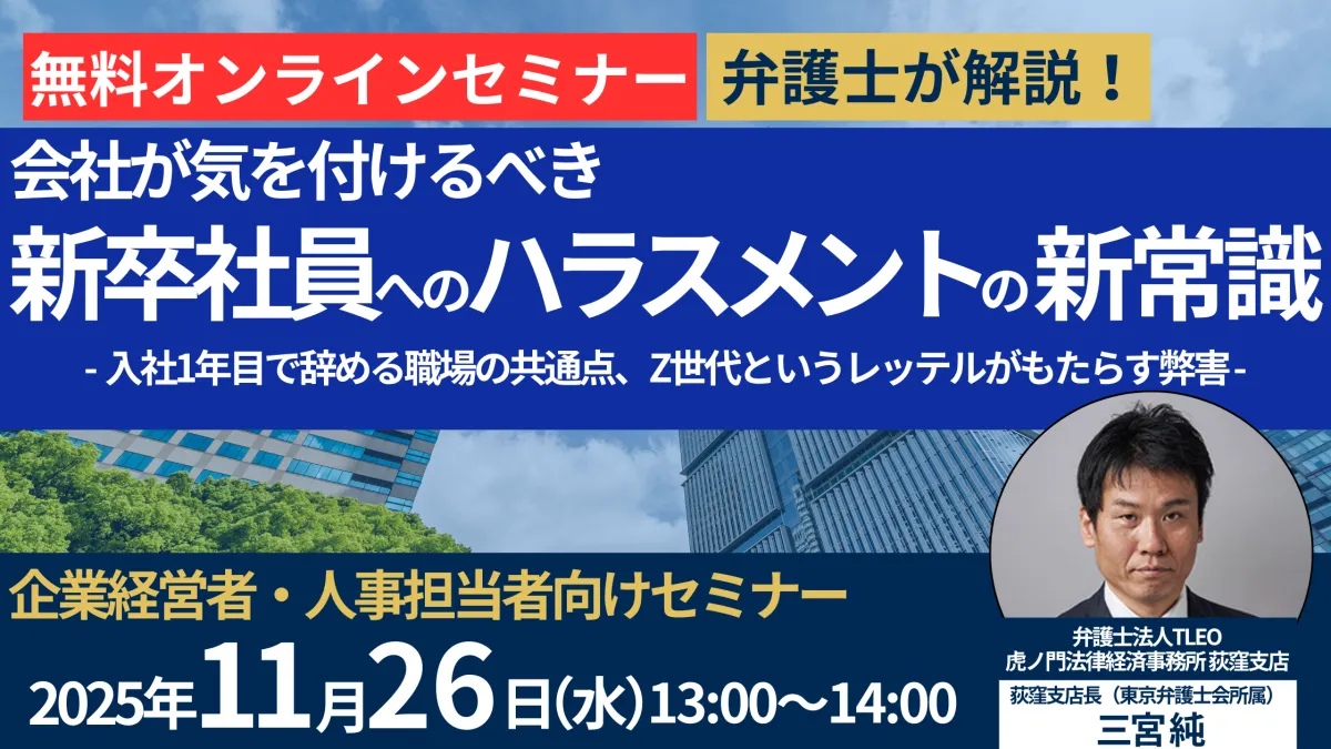 近年、新卒社員の離職率が高まっており、その要因の一つとしてハラスメントが挙げられています。特にZ世代と呼ばれる新しい世代の価値観やコミュニケーションスタイルを理解しないままには、企業のマネジメントにおいて新たなトラブルが発生する可能性が高まります。こうした背景を踏まえ、弁護士法人TLEO虎ノ門法律経済事務所は、オンラインセミナー『会社が気を付けるべき新卒社員へのハラスメントの新常識』を開催します。このセミナーでは、新卒社員をどのように指導すべきか、またハラスメントを避けるためには何に注意するべきかを具体的に解説します。
