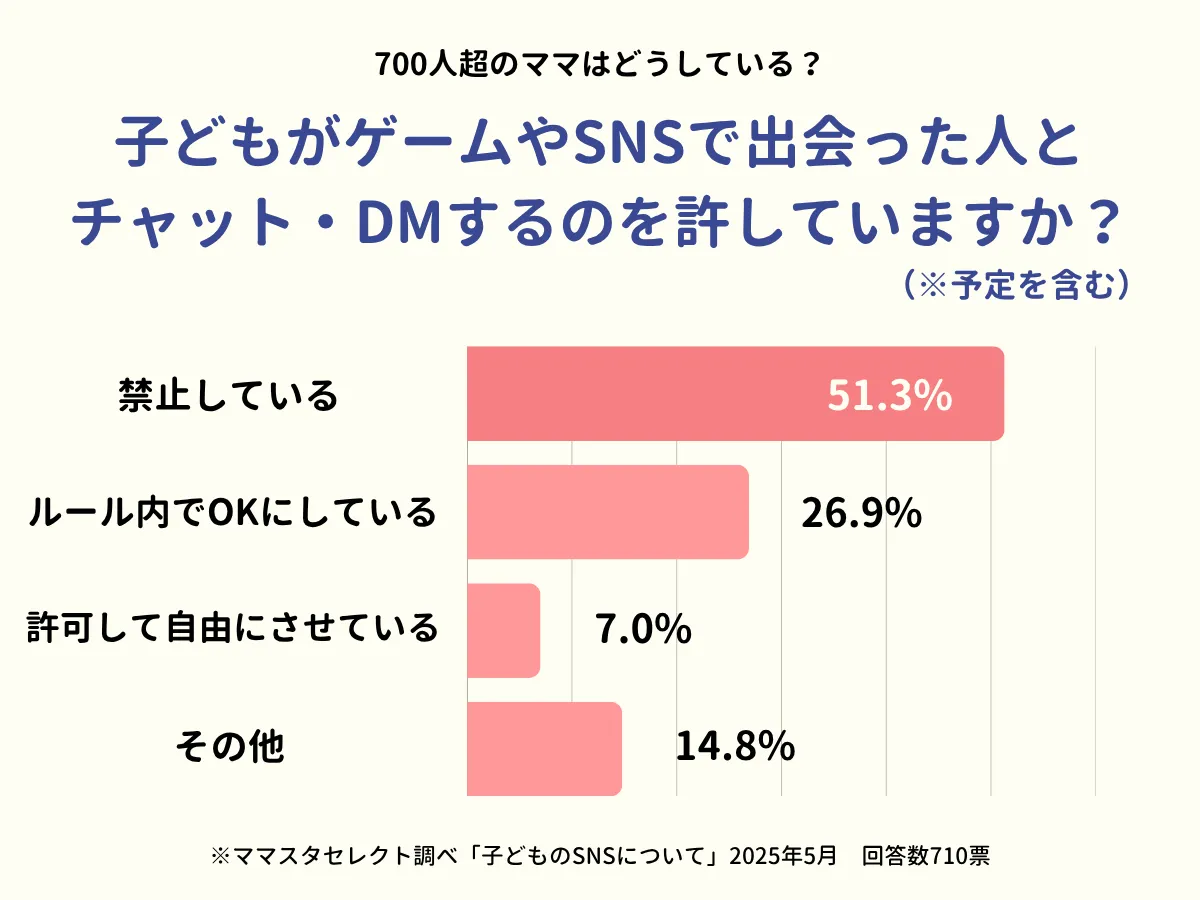 インターネット利用が日常化する現代において、子どもたちが知らない人とやり取りをするリスクも増加しています。そこで、「子どもがゲームやSNSで出会った人とチャットやDMをすることを許可していますか?」というテーマでアンケートを実施しました。