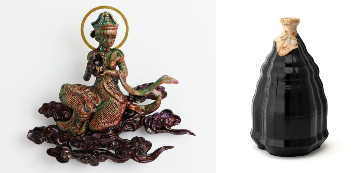 北浦氏は、縄文時代から続く漆の精神を現代に昇華させているアーティストです。彼の作品は、目に見えない感情や恐れを漆という素材を通じて形にし、心の平穏を求める姿勢を持っています。「呼継」技法を用いた《陶片転生》シリーズでは、不要となった陶片を蘇らせ、新たな命を吹き込む作品として観客の心をつかんでいます。特に、《異世界雲中菩薩》などの作品は、アニメ文化や仏教的な要素を巧みに組み合わせ、現代的な解釈を展開しています。