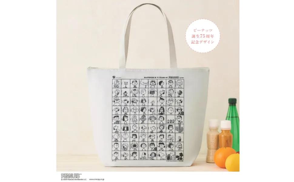 今回の保冷バッグは、スヌーピーがデザインされた特別なアートで彩られており、75周年を祝うために描かれた様々なキャラクターたちが登場します。淡いパールグレーの生地はどんなスタイルにもピッタリマッチし、見る人々をほんわかとした気持ちにさせてくれます。