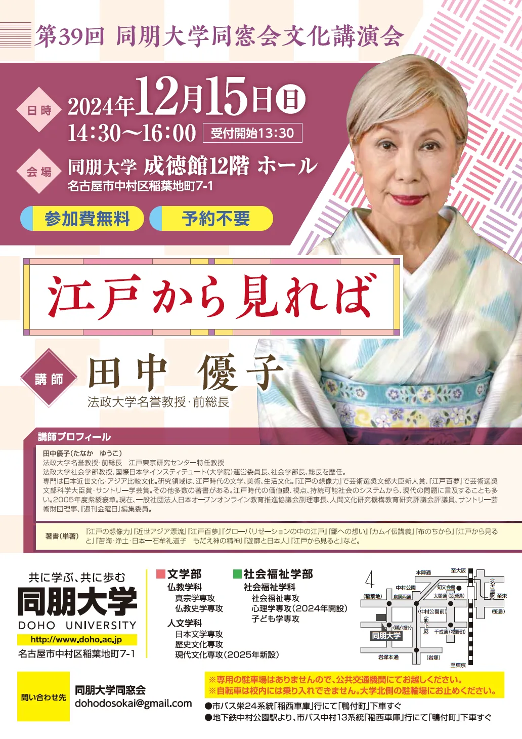2024年12月15日(日)、名古屋市の同朋大学にて田中優子氏による文化講演会「江戸から見れば」が開催されます。この講演会は、同朋大学同窓会の取り組みとして毎年行われており、同窓生だけでなく一般の皆様にも公開されています。田中優子氏は、法政大学の名誉教授であり、前総長としても知られており、その豊富な知識と経験を基に、江戸時代の文化についての深い洞察を提供します。