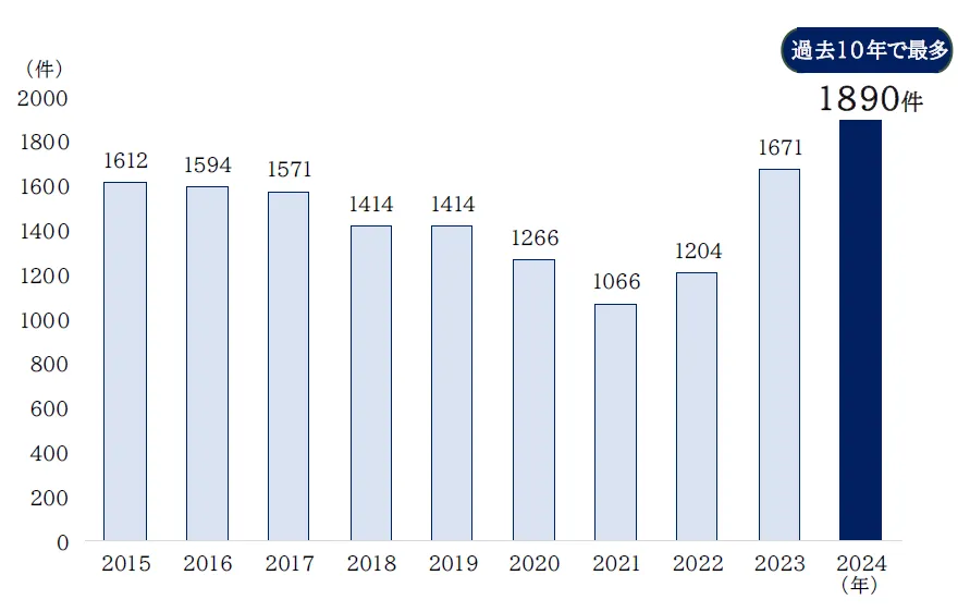2024年度の建設業における倒産件数が1890件に達し、過去10年間で最も多い数値を記録しました。この現象は小規模事業者に多く見られ、業界全体が厳しい状況に直面しています。