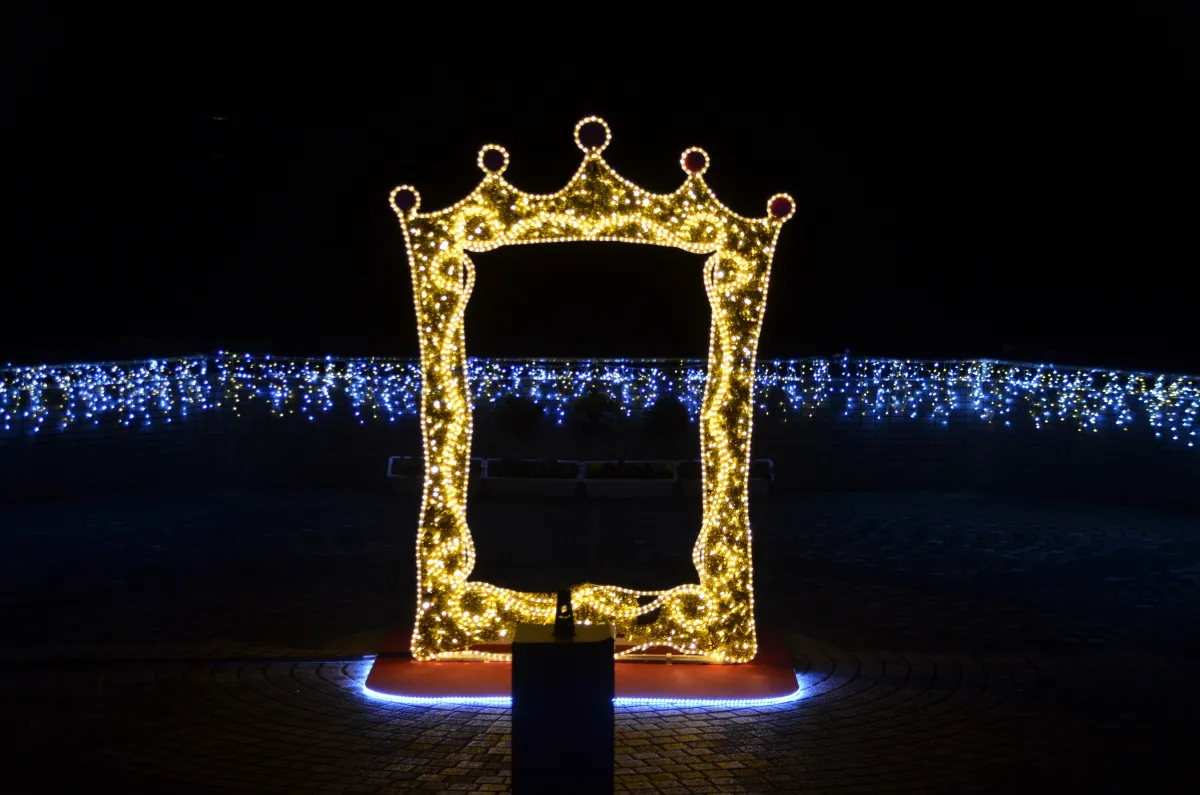 午後5時から10時まで点灯される巨大フォトフレーム型のイルミネーションも必見です。このイルミネーションは、見上げるとその大きさに圧倒されます。ぜひ、カメラを持参して、素敵な写真を撮影してください。夜になると、このイルミネーションが空を美しく彩り、特にロマンティックな雰囲気が漂います。カップルや家族連れにも人気で、冬の夜を楽しむのにぴったりのスポットです。
