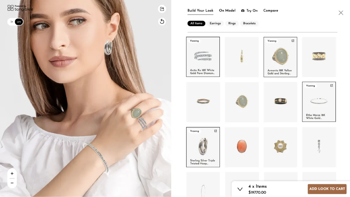 「Build Your Look」では、商品詳細ページにボタンやウィジェットを埋め込むことで、ユーザーが自由にジュエリーや時計を組み合わせ、バーチャルで試着することができます。これにより、従来の静的な商品画像とは異なり、よりリアルな装着イメージを提供します。顧客が直感的に操作してスタイルを構築できるため、購買率や平均注文額の向上にもつながります。