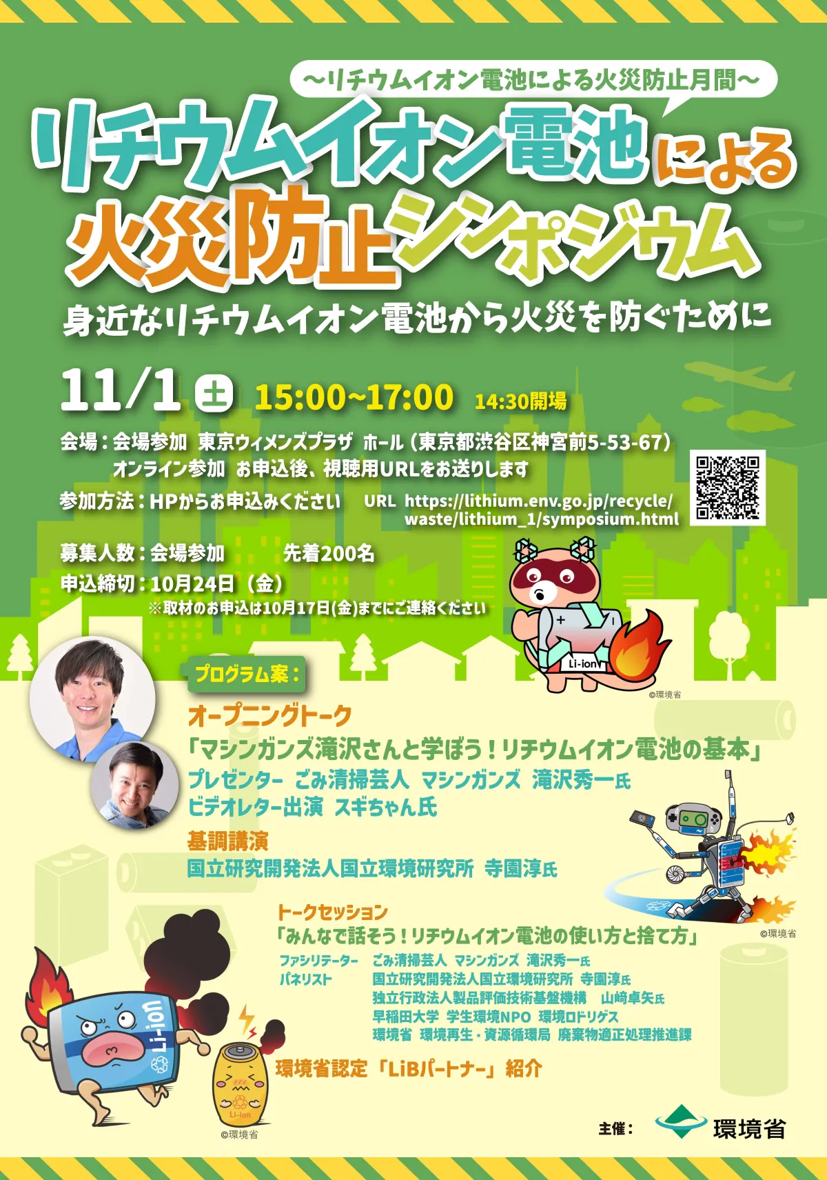 令和5年度には、全国で8,543件の火災がこの電池に関連して発生しており、この深刻な状況を受けて環境省は火災防止に向けた取り組みを強化しています。シンポジウムでは、専門家による講演やトークセッションを通して、火災の現状や安全な使用と廃棄方法について考え、一人ひとりが何ができるかを探ります。