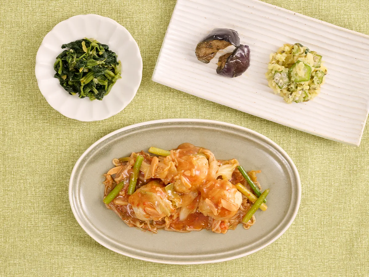 メインの鶏団子の他にも、さっぱり仕上げたほうれん草の塩だれや、ピリ辛に味付けしたなす、旨塩ポテトサラダの刻み高菜が組み合わさった副菜が魅力。これにより、辛さやスパイシーさの中に、しっかりとしたバランス感が加わり、食事が一層楽しめます。スプーンで混ぜるたびに広がる香りと旨味は、ただの冷凍食品を超えた美味しさを提供してくれます。