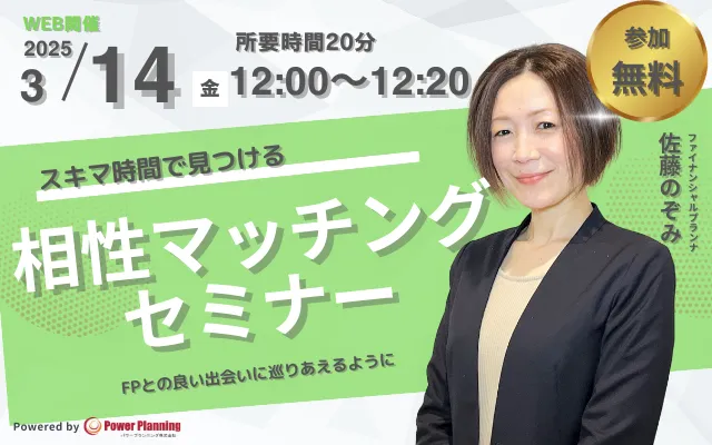 2023年3月14日(金)12時、無料マネーセミナーサービス「アットセミナー」による新しいオンラインセミナー「相性マッチングセミナー」が開催されます。このセミナーでは、参加者が自分にぴったりのファイナンシャルプランナー(FP)を見つける手助けを行います。講師は、経験豊富な佐藤のぞみFPです。