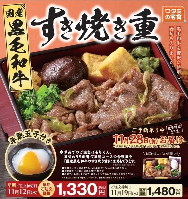2025年10月23日、ワタミ株式会社が運営する食事宅配サービス「ワタミの宅食」が特別弁当「国産黒毛和牛のすき焼き重」の販売を開始しました。この特別弁当は、すき焼きの魅力を詰め込んだ一品です。当商品は、11月28日(金)にお届けされます。