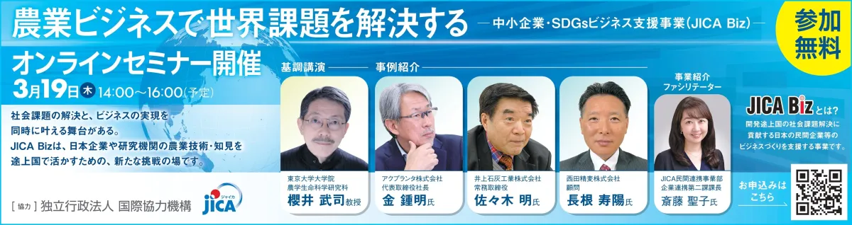 2026年3月19日(木)、株式会社日本農業新聞はオンラインセミナー「農業ビジネスで世界課題を解決するー中小企業・SDGsビジネス支援事業(JICA Biz)ー」を開催します。このセミナーでは、社会課題の解決とビジネス実践をテーマに、具体的な事例を通じて農業分野における新たなビジネス展開の可能性を探ります。
