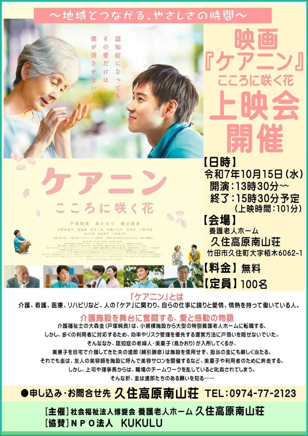 大分県竹田市に位置する養護老人ホーム「久住高原南山荘」では、来る10月15日(水)に感動的な映画『ケアニン~こころに咲く花~』の上映会が行われます。この上映会は、介護や医療に携わる人々の思いと誇りをテーマにしており、地域の皆と共に「やさしさを分かち合う時間」を提供することを目的としています。