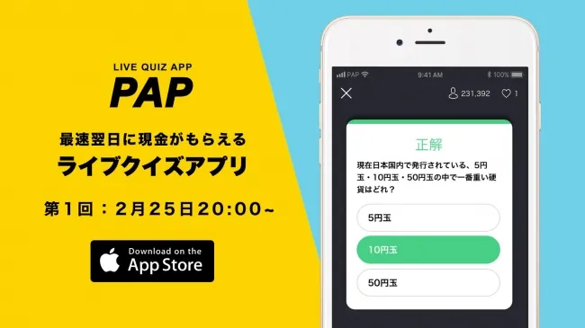 2月25日(日)の20時、待望のライブクイズアプリ「PAP」が初めての配信を行います。このアプリは、全10問のクイズに挑戦し、正解することで現金を得ることができる新しいエンターテインメントの形です。参加者は、特定の決済サービスを通さず、日にちを跨ぐことなく、迅速に賞金を受け取ることが可能です。