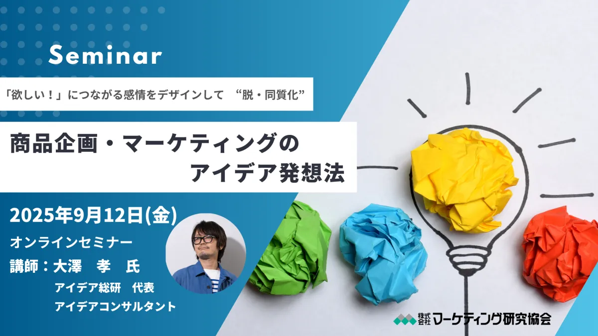2025年9月12日、株式会社マーケティング研究協会主催の「アイデア発想法オンラインセミナー」が開催されます。このセミナーでは、講師として大澤孝氏が登壇し、アイデア生成のプロセスや商品企画の実践的なテクニックを伝授します。