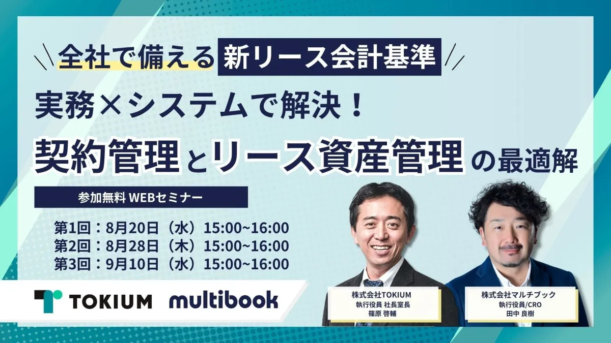 このような状況を受けて、株式会社マルチブックは株式会社TOKIUMと協力し、全社で備える新リース会計基準に関する無料Webセミナーを開催することに決定しました。このセミナーでは、契約の識別フェーズからリース資産の管理に至るまで、実務とシステムの最適な進め方を学ぶことができるでしょう。