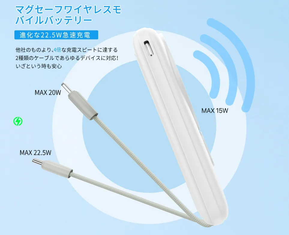 このモバイルバッテリーは、MagSafe対応のデバイスに対して最大15Wのワイヤレス充電を提供。iPhone 12以降の機種にしっかり吸着し、移動中でも安定した充電が行えます。もしiPhone 12未満のモデルやAndroid端末を使用している方も、内蔵のケーブルを使えば問題ありません。