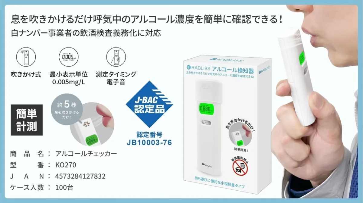 RABLISS KO270アルコール検知器 が、日本のアルコール検知器協議会による正式な認定機器として選ばれました。