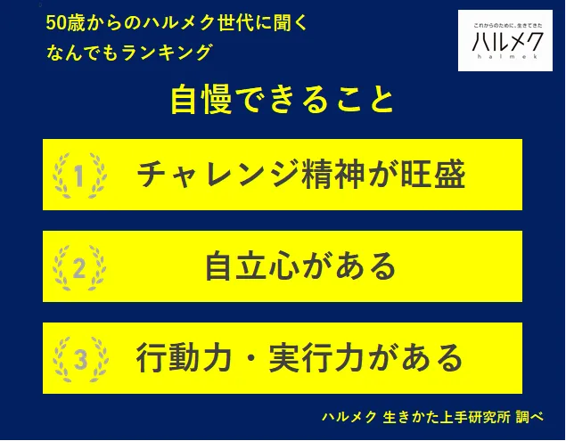 3位にランクインした「行動力・実行力がある」は、世代を問わず同じように重視されているポイントで、実際に各世代の体験から得た知恵を、自分の行動に生かす意欲が反映されているのでしょう。このように、年齢を重ねることの価値が、より具体的な自慢できる能力として顕在化しています。