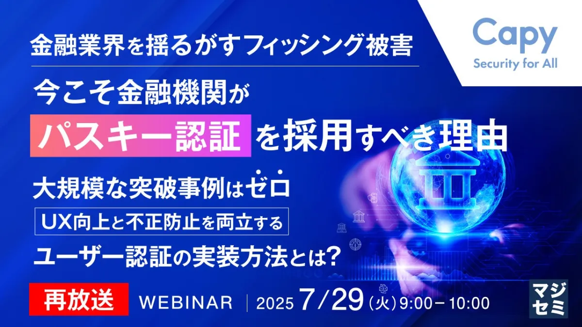 主催はCapy株式会社であり、協力企業には株式会社オープンソース活用研究所とマジセミ株式会社が名を連ねています。参加を希望される方は、詳細や申込みリンクをご確認ください。金融業界が直面する新たなリスクに対する効果的な対策を、一緒に学びましょう。