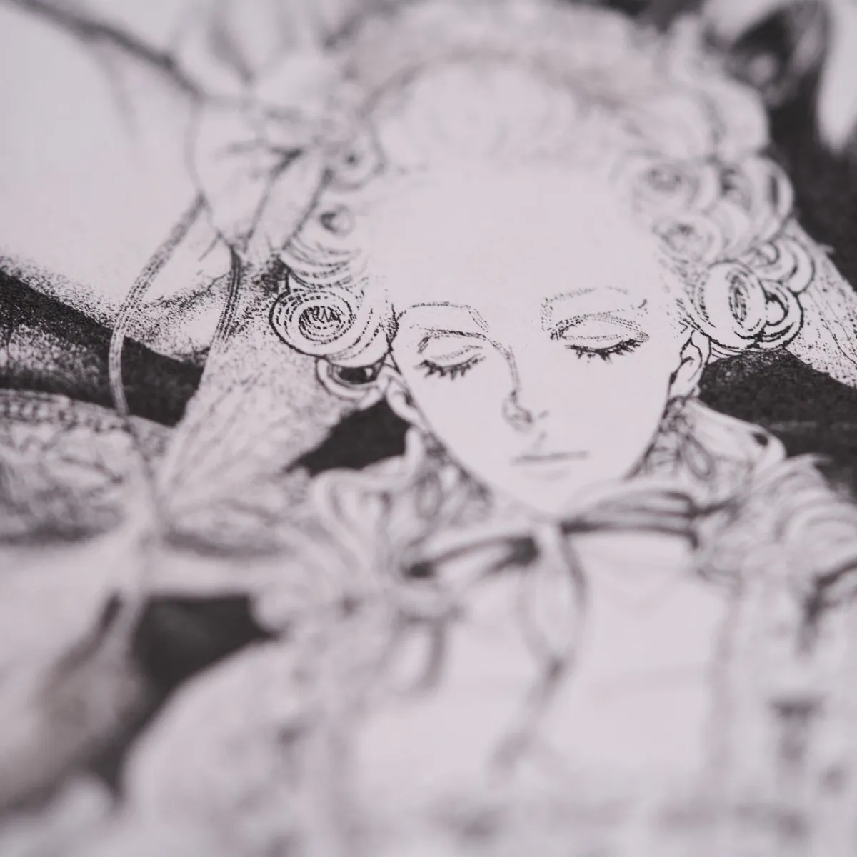 坂本はフルデジタルで作画を行っており、その手法により紙が破れる心配がなく、細部にわたる描き込みが可能になりました。人物の表情や衣装のディテールは圧巻で、特にマリー・アントワネットの髪型や繊細なレース、煌めくアクセサリーなどは、技巧的に描かれています。特に彼女の顔のラインは、極細線でぼかす技法を用いることで、柔らかな優しさが漂う仕上がりになっています。