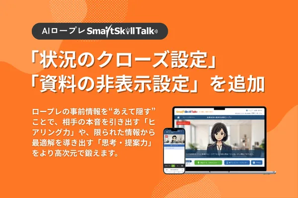 今回追加されたのは、状況のクローズ設定と資料の非表示設定という二つの機能です。これにより、あえて特定の情報を隠すことで、参加者が相手の本音やニーズを引き出すトレーニングが行えるようになります。