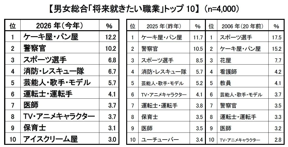 子どもたちの将来就きたい職業として、トップは「ケーキ屋・パン屋」、続いて「警察官」、そして「スポーツ選手」となっています。注目すべきは、男女の合計で順位が前年と同様だった一方、4位には急上昇した「消防・レスキュー隊」がランクインした点です。この傾向は、ますます人を助ける職業への関心が高まっていることを示唆しています。