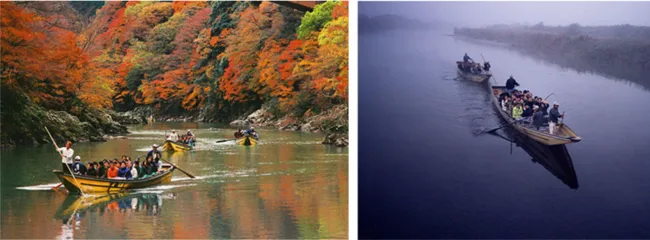 「朝霧」便では、亀岡の特徴的な霧が立ち込める幻想的な朝の時間、亀岡市の乗船場から嵐山へ向けて出航します。定期運航は朝9時からですが、この特別便は朝8時に出発。好天時には、保津川の水面に映る霧が美しい景観を作り出し、普段の川下りとは異なる風情を味わえます。