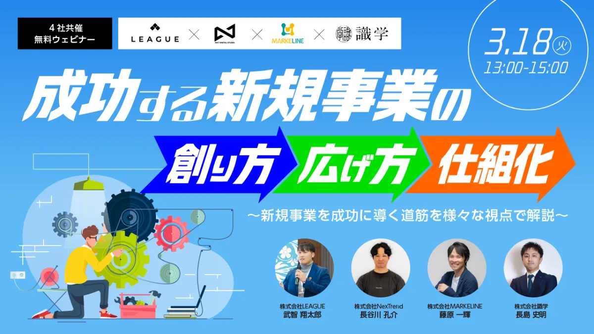 株式会社LEAGUEが主催する無料オンラインセミナー「成功する新規事業の"創り方"→"広げ方"→"仕組化"」が、2025年3月18日(火)に開催されます。これは、新規事業の立ち上げや拡大、安定化を目指す経営者や事業責任者の方々に向けて、必須の知識を提供することを目的としています。