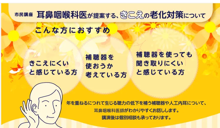この市民講座のテーマは「聴こえに悩んでいませんか〜難聴医療の最前線〜」。年齢を重ねるに伴い、多くの人が直面する聴力の低下に関連する情報を提供し、補聴器や人工内耳といった医療の選択肢について耳鼻咽喉科医師からわかりやすく解説されます。症状に悩む方や、将来への不安を抱える方々にとって、非常に有意義な時間になるでしょう。