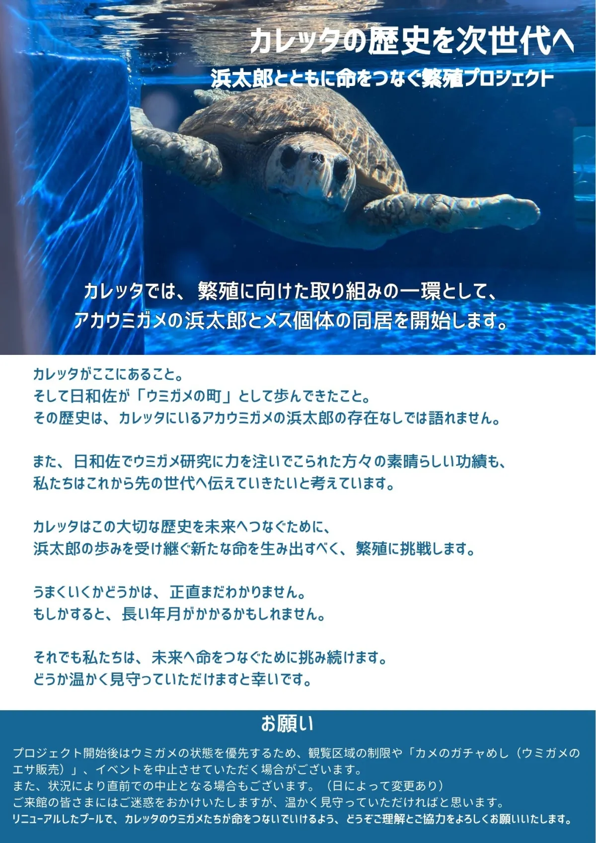 『浜太郎繁殖プロジェクト』では、カレッタの歴史の中で重要な役割を果たしてきたアカウミガメの浜太郎とメス個体が同居を開始します。この取り組みの目的は、浜太郎の優れた遺伝子を未来の世代へ繋げ、新たな命を生み出すことです。