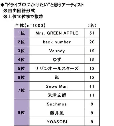 ドライブ中のBGMとしてよく選ばれたアーティストは、Mrs. GREEN APPLE、back number、Vaundyさんなどが上位にランクインしました。特にMrs. GREEN APPLEは、最近のリリースで注目を集めているアーティストであり、多くの若者からの支持を受けています。運転中に聴く曲としてふさわしい、明るく前向きな楽曲が揃っているのが特徴です。