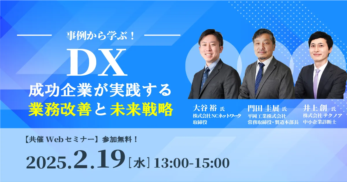 株式会社テクノアと株式会社NCネットワークが共同で、中小製造業の経営者や担当者のために特別オンラインセミナーを企画しました。2025年2月19日、水曜日の午後1時から3時まで、Zoomを利用したLIVE配信で行います。本セミナーでは、デジタル化やDX(デジタルトランスフォーメーション)の導入方法、業務改善の具体例などについて、専門家がわかりやすく解説します。