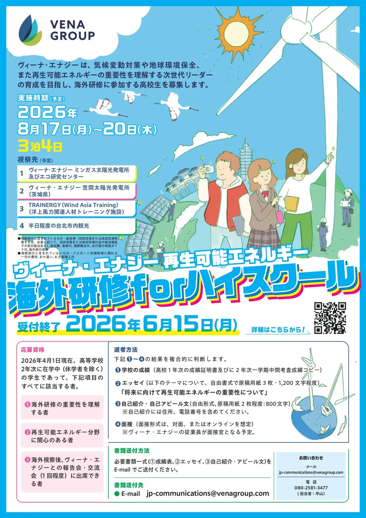 アジア太平洋地域で展開するグリーンソリューションのリーディング企業、ヴィーナ・エナジーは、次世代のリーダーを育てるための海外研修プログラム「再生可能エネルギー海外研修 for ハイスクール」を2026年8月17日から開催することを発表しました。本プログラムも今年で4回目を迎え、再生可能エネルギーやサステナビリティの重要性について深く学ぶ機会を提供することを目的としています。