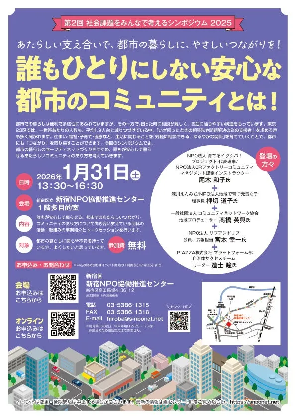 2026年1月31日、群れを成すようにして人生を歩むシャンペーンとして、新宿区立新宿NPO協働推進センターが主催する「第2回社会課題をみんなで考えるシンポジウム」が開催されます。このイベントは「誰もひとりにしない安心な都市のコミュニティとは!」というテーマで、多様性に富んだ都市生活の課題を共に考える重要な機会です。